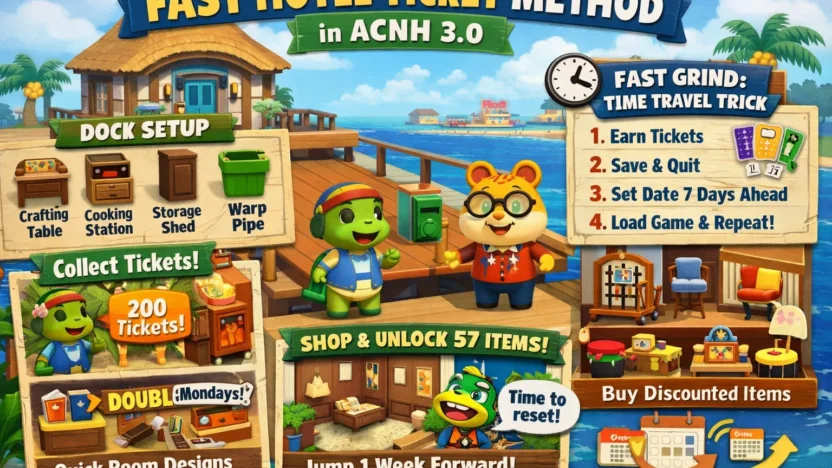 The 3.0 update introduced one of the biggest new progression systems in Animal Crossing: New Horizons: the Hotel. Along with it came a brand-new currency, Hotel Tickets, used to unlock 57 exclusive hotel items, including furniture, décor, and special Nintendo-themed rewards.
